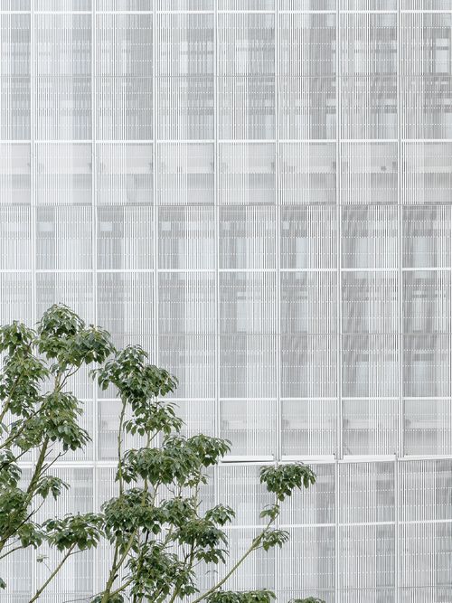 A new skin of white perforated metal panels envelops and unifies the existing building parts. This approach conceals the building's original, rigid details while giving it a fresh, cohesive appearance.