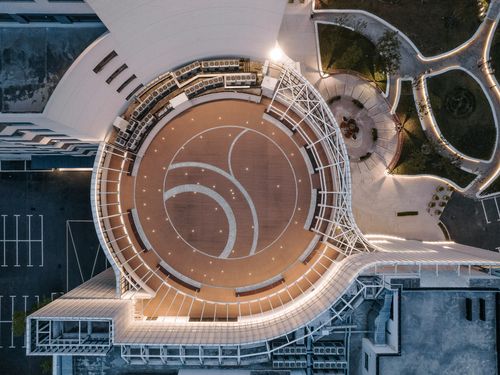 设计上,我们采用白色穿孔金属板,以弧形设计语言重塑建筑外观,覆盖原建筑繁琐细节,赋予其流畅、现代的形象。新增室外疏散楼梯融入表皮系统,与整体设计和谐统一,提升安全性与实用性。